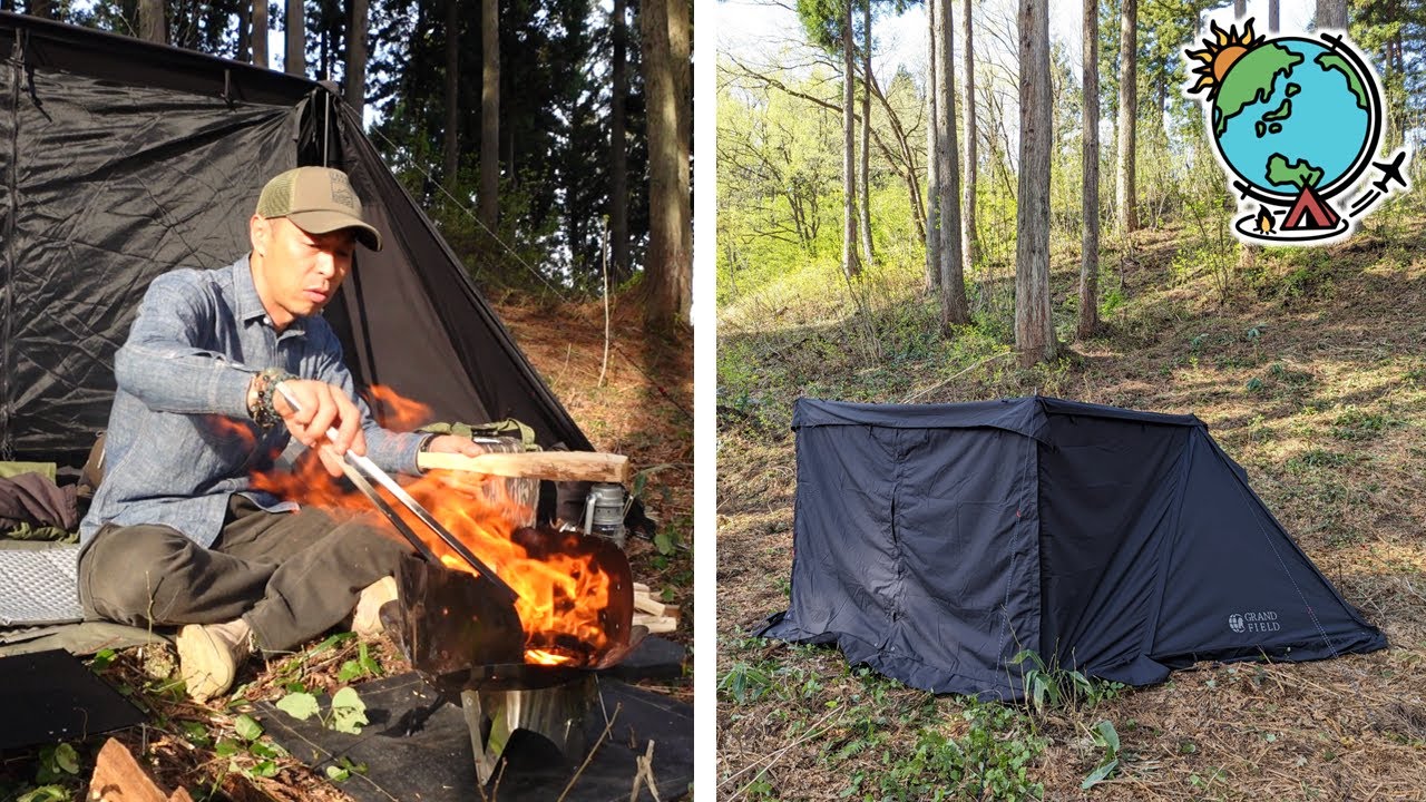 静かな山中で焚き火とブラックテントで無骨ソロキャンプ ※セリフ無し 野営ASMR