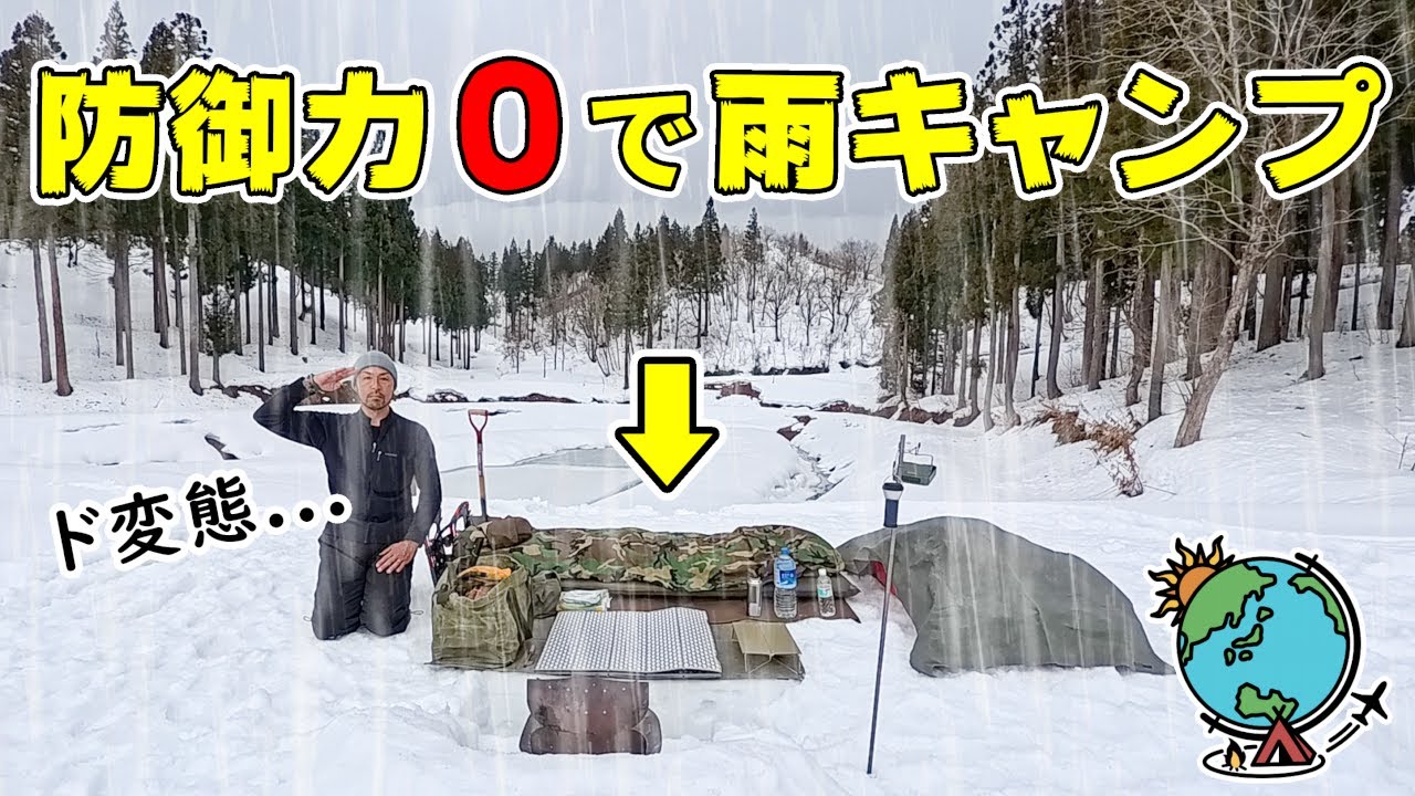 ここは山の中。雨や雪が降っているのに、テントも無し、タープも無しの雪中キャンプに挑戦する変態キャンパーの物語。